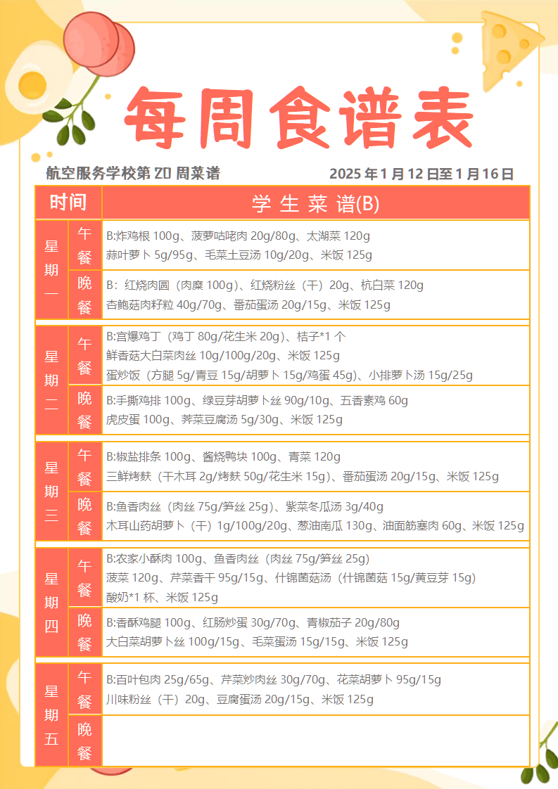 2025学年第一学期第二十周学生菜谱
