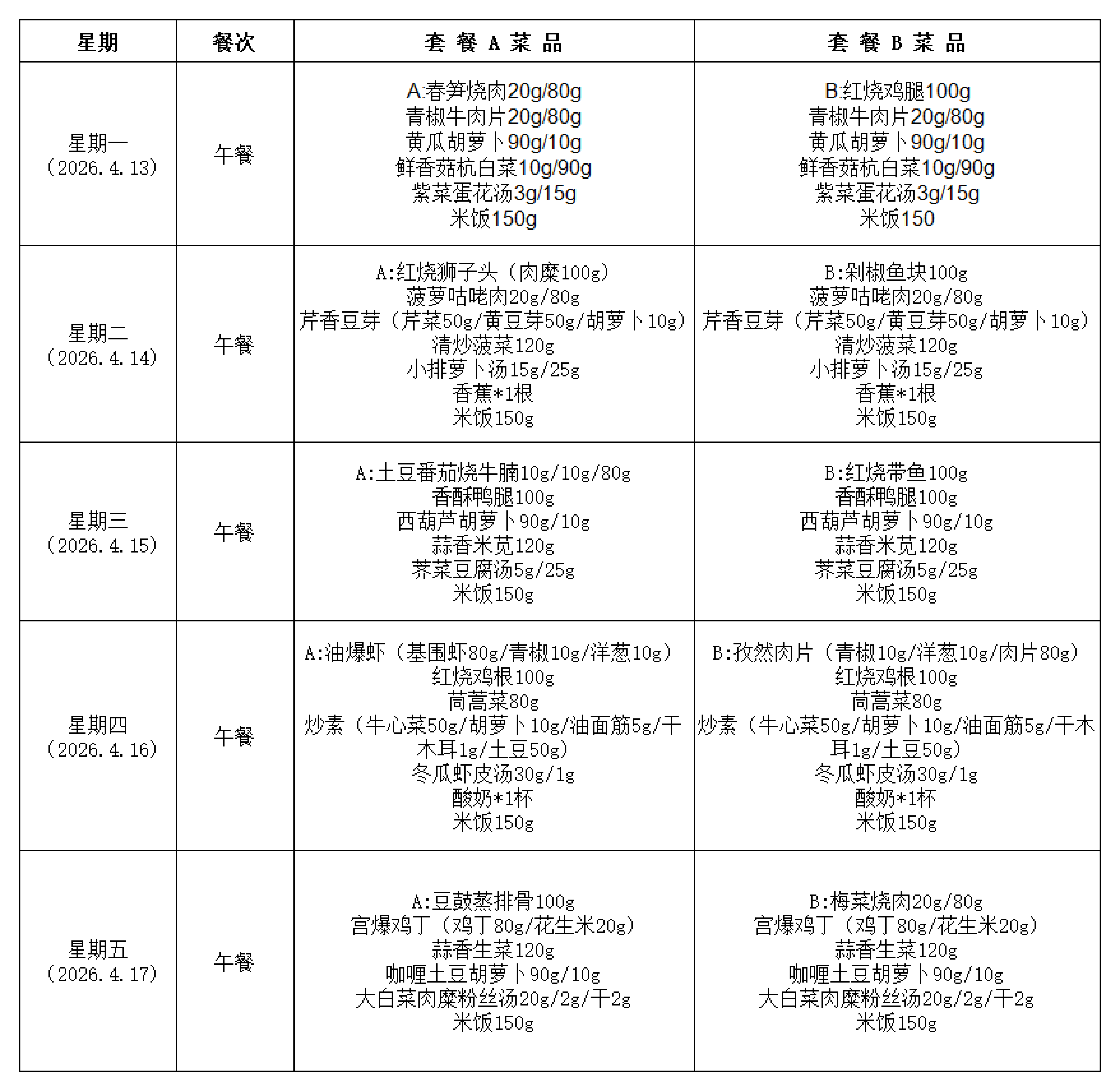 2025学年第二学期第七周学生菜谱