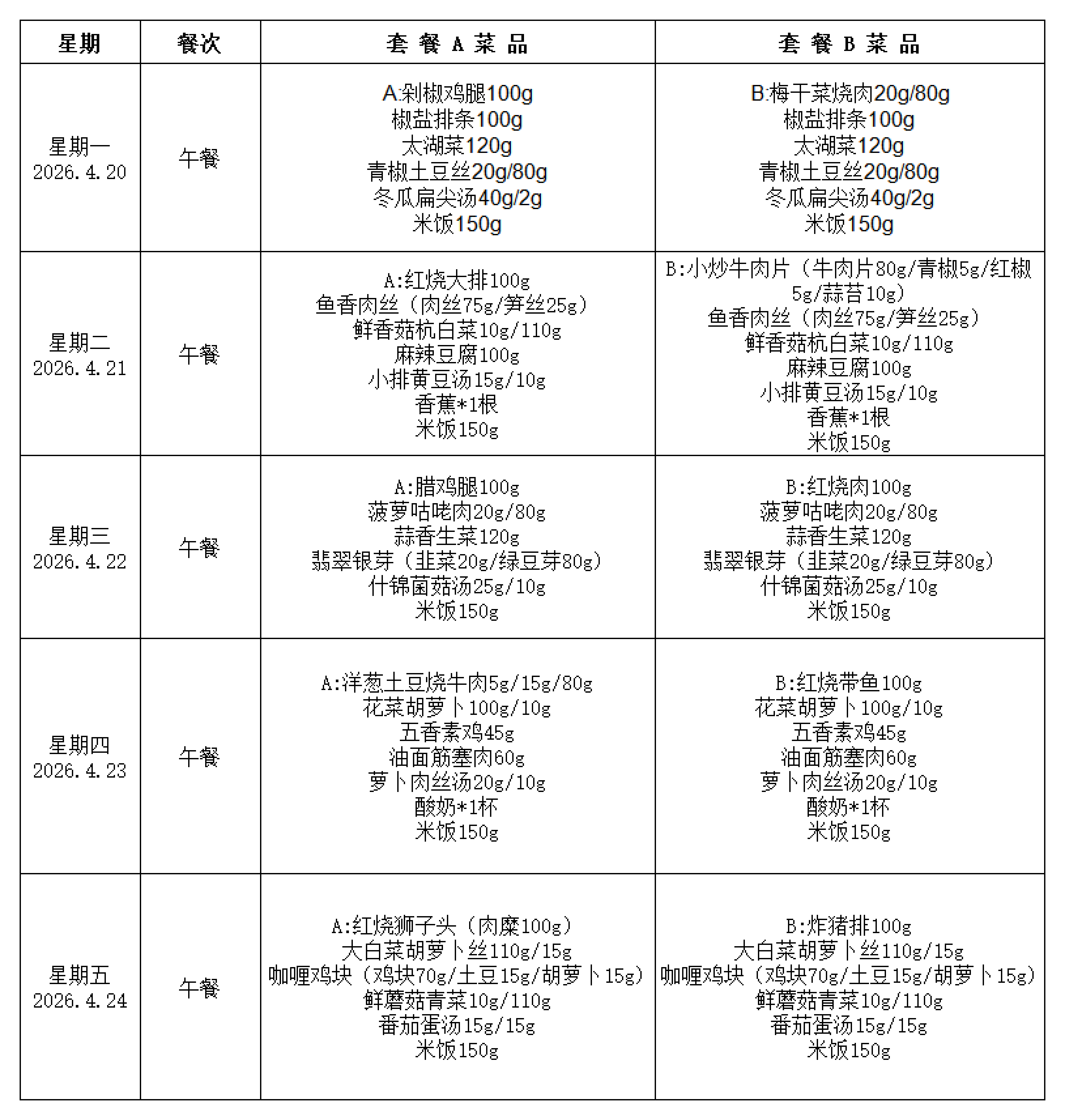 2025学年第二学期第八周学生菜谱