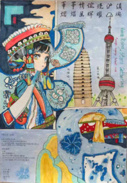 24机电2班的海报布局清晰且配色素雅,整体为蓝紫色,语言形式为中英结合。画面中绘有大理古城和东方明珠,均为云南与上海的标志性建筑,象征着本次活动我校与云南校方友好的合作情谊;右上角绘有身着云南白族传统服饰的动漫形象,并在下方标明了白族文化的注解;右下角相应绘制了一匹扎染的棉麻布,代表了云南的非遗扎染文化,同时绘有江山,象征着中华民族深厚的文化底蕴和文化传承。