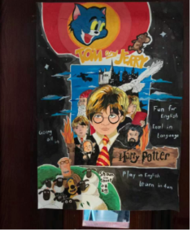 25空乘2班绘制了两张海报,整体结合了空乘部校服、云南白族动漫形象和漫画。画面简洁且配色丰富,包含了中日英三种语言。上方海报撰写了沪滇协作的过往历程,文字周围还添置了大量植物,象征着云南多彩的民族文化和淳朴的生态风貌;繁花更是代表了生命蓬勃旺盛和青春的美好。下方海报整体以漫画的形式呈现,描述了校园的学习与生活,并在中央处用英语表达了对外语节的热爱之情。