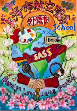 25航运2班的海报色彩鲜艳、画面饱满,结合了具有本校特色的飞机元素和象征世界的地球元素。画面还包含日语、韩语、英语和中文四种语言。相握的两只手代表外语节能使航校学生了解和热爱世界各国语言文化,实现文化交融。同时画报上还包含麦克风、耳机、音符、画板、毛笔等元素,分别对应了本次活动中歌唱、演讲、海报绘制、书法等比赛项目。两侧绘制的玉兰花,突显主题中的“沪”字,代表了航校学子;下方的山茶花突显主题中的“滇”字,代表了云南学子;二者均表现了学生朝气蓬勃的生命力和对外语节活动的热爱。