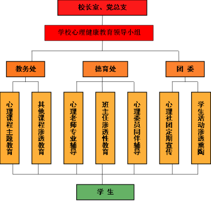 不断提升学校心理健康教育工作能力是提升学校办学质量的基础,更是贴合中职学生终生发展奠定良好的心理基础的需要。因此,学校非常重视心理健康教育工作,明确认识到心理健康教育工作在学校教育工作中的重要地位。为此,我校成立了心理健康教育领导小组,对学校的心理工作进行了具体有效的指导和督促。我校心理健康教育的组织框架是:由校长直接领导,教务处、德育处和团委三管齐下,其中主要以教务处的心理课、德育处的心理咨询室和团委的心理社团为主开展各类心理健康教育活动,并带动全体教师尤其班主任参与其中。各部分工作职责分明,运行有效,定期研讨,及时了解学校心理健康教育工作的实施情况和学生心理健康发展状况。