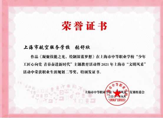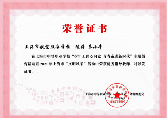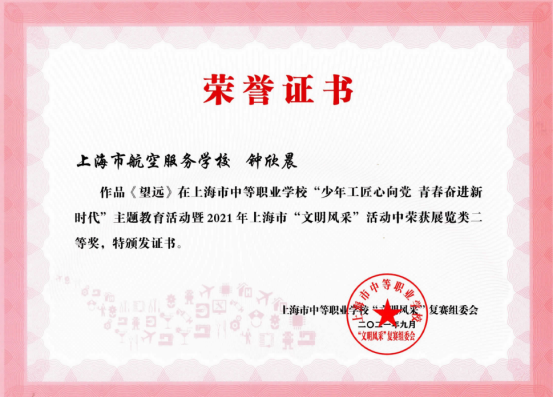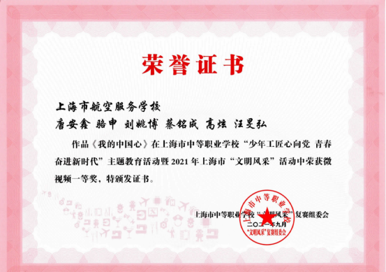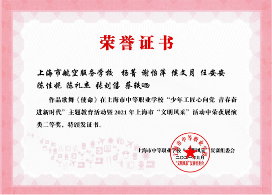 在每年的全国“文明风采”德育主题活动中我校取得了多项优异的成绩。如2021年我校共送出31个作品,参加了12个项目,获得了27个奖项。其中,骆申 汪旻弘、高炫、唐安、刘姚博、蔡铭成等同学的微视频作品《我的中国心》荣获了一等奖,辅导老师获得了优秀辅导奖。舞蹈《芳华》、《飞行的我们》、《使命》、《红心向党》获得了2个二等奖和2个三等奖;两个小品分别获二等奖和三等奖;两个朗诵均获三等奖;两个情景剧获三等奖和优秀奖;五个朗诵分别荣获了二、三和优秀奖;书法和职业规划分别获得3个二等奖和2个三等奖、1个优秀奖;摄影作品获得了3个优秀奖。现选取以下5张获奖证书。